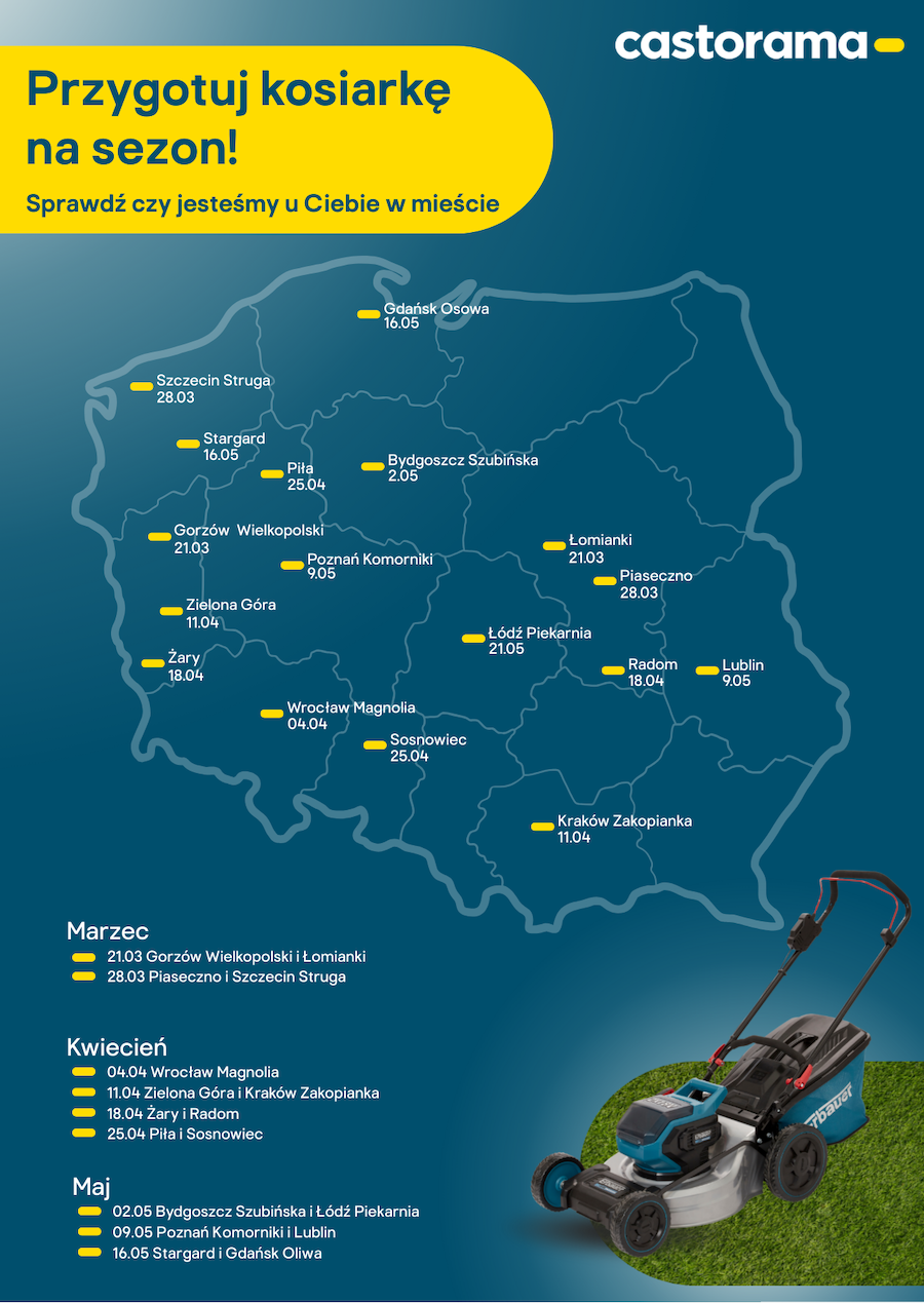 Castorama startuje z sezonową akcją serwisowania kosiarek spalinowych i elektrycznych. Wydarzenia będą odbywać się w soboty od marca do maja, w godzinach 10:00–18:00 w wybranych sklepach Castorama. To odpowiedź na rosnące potrzeby klientów, którzy chcą szybko przygotować sprzęt ogrodniczy do sezonu, bez konieczności umawiania wizyty w serwisie i bez długiego czasu oczekiwania.