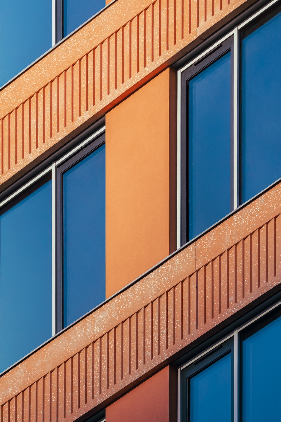 Prefabrykowane elementy elewacyjne powstały w wyspecjalizowanym zakładzie polskiej marki CMSO, na indywidualnie zaprojektowanych formach. Do ich wykonania zastosowano autorską mieszankę betonową z użyciem starannie dobranego kruszywa o określonym kolorze i frakcji. Już na etapie projektowym założono, że elewacja ma pracować ze światłem i zmieniać się wraz z porą dnia.