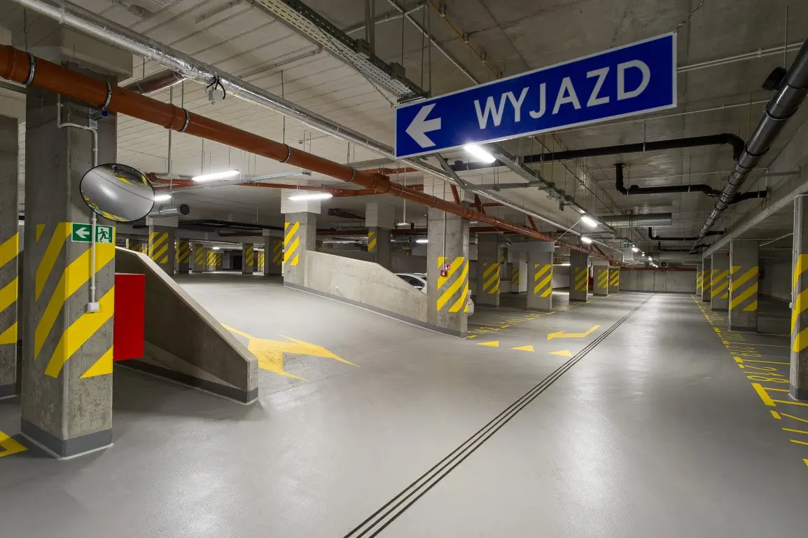 Posadzki żywiczne Deckshield na parkingu w inwestycji Osiedle Bokserska wykonała firma Dal-Lickiewicz sj Posadzki Przemysłowe z Warszawy, autoryzowany wykonawca Flowcrete.