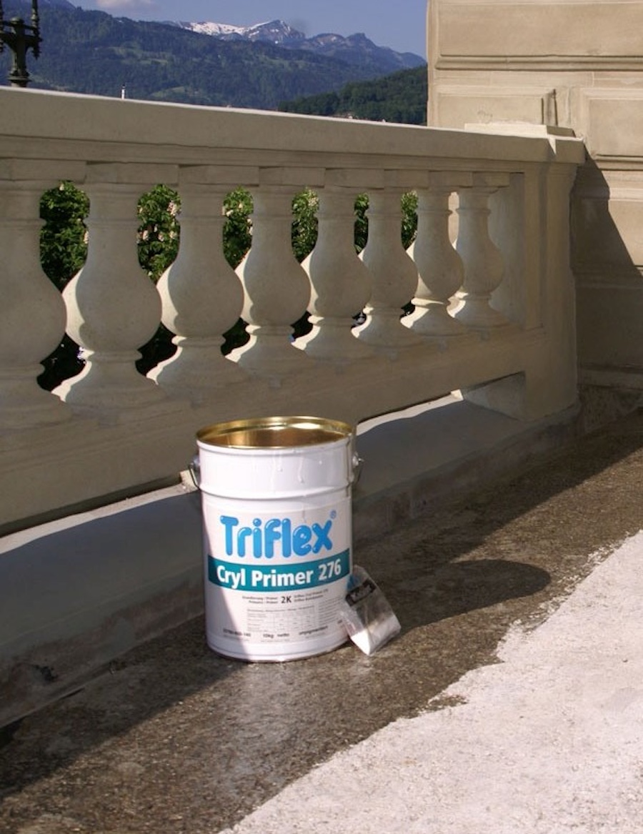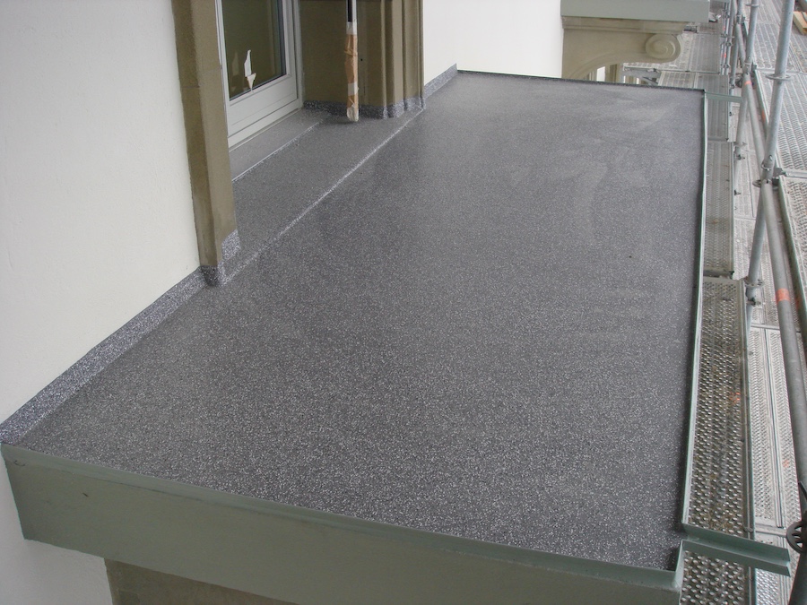 W newralgicznych miejscach, takich jak krawędzie balkonu czy połączenia, wykorzystano Triflex ProDetail – płynny system do hydroizolacji detali na bazie żywicy PMMA, który wraz z zatopioną włókniną wzmacniającą tworzy bezszwowe i odporne uszczelnienie, nawet na skomplikowanych geometrycznie elementach. Dzięki temu nie ma potrzeby grubienia krawędzi i można zachować oryginalną geometrię balkonu.