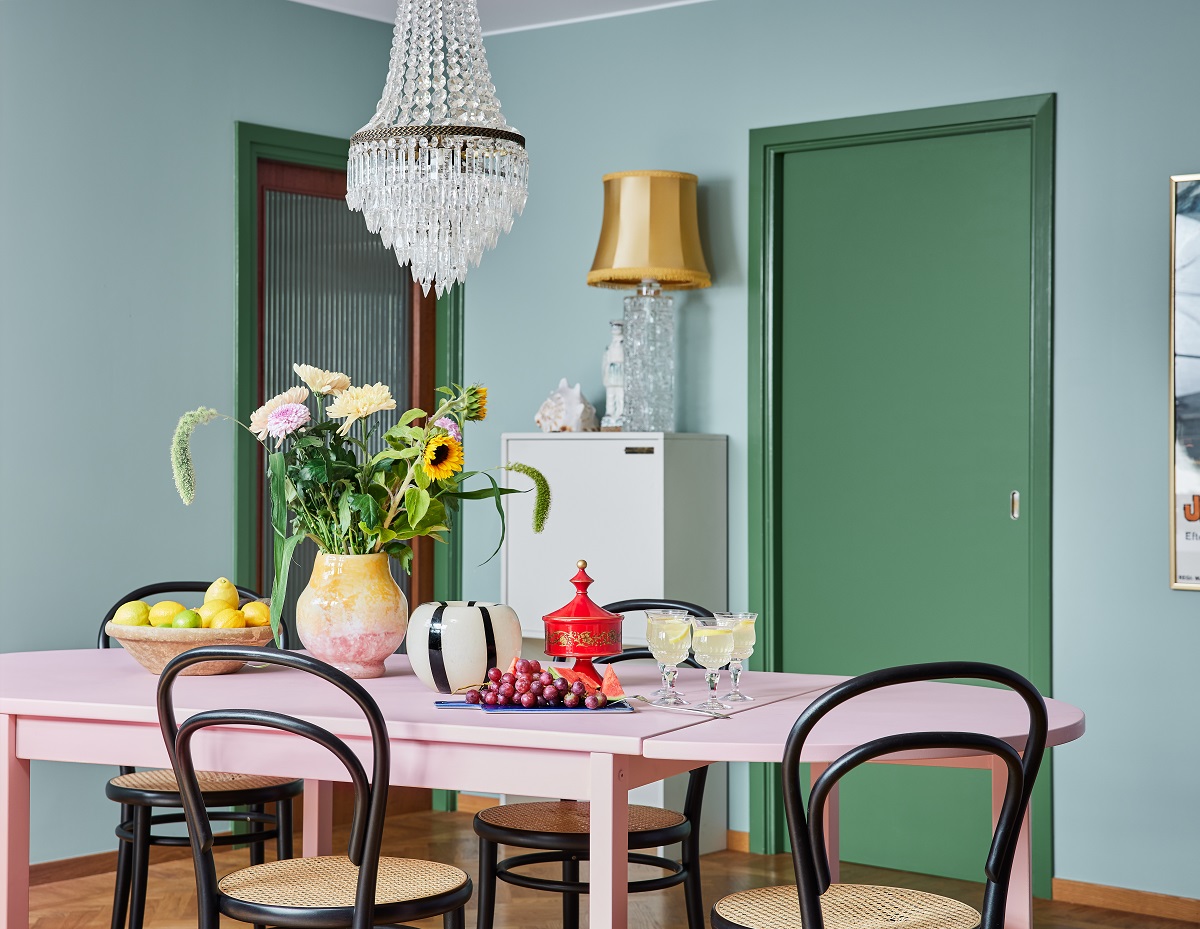 Ściany we wdzięcznym odcieniu Poetic z lekką nutą zieleni będą z kolei świetnym pomysłem na stworzenie tryskającej kolorami artystycznej jadalni. W zestawieniu z zielonymi drzwiami czy różowym stołem, które z łatwością można samodzielnie wykreować z użyciem emalii Beckers Designer Universal, powstanie niezwykłe ożywcze w klimacie wnętrze, zachwycające kolorami o każdej porze roku. Dodatkową nutę finezji wprowadzi kryształowy żyrandol w stylu pałacowym, przełamujący sielski klimat aranżacji.