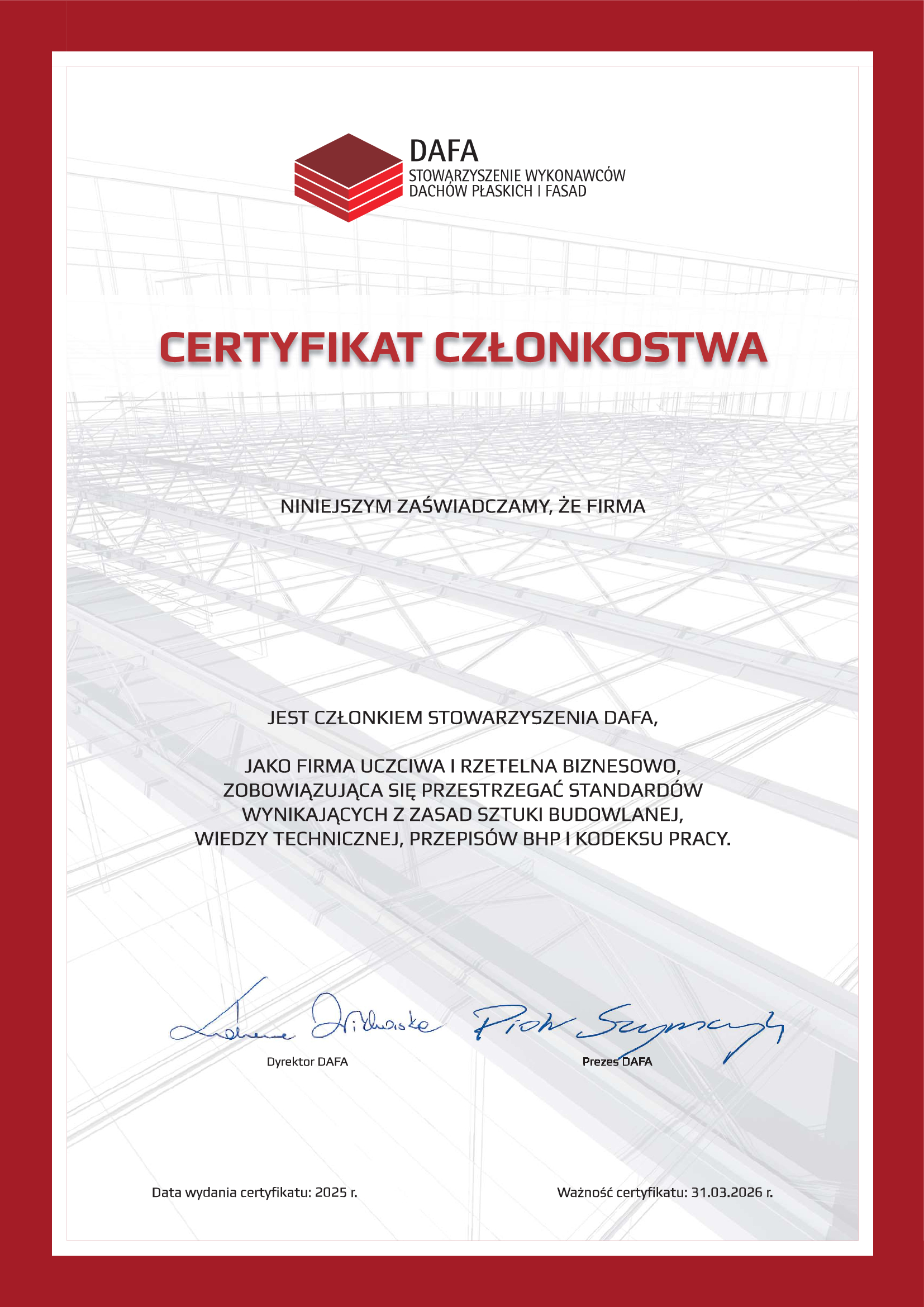 Certyfikat członkostwa w DAFA to czytelny znak jakości i zaufania – potwierdzenie, że firmy te działają w oparciu o aktualną wiedzę techniczną, z poszanowaniem zasad bezpieczeństwa, uczciwości i pełnej transparentności działań biznesowych.